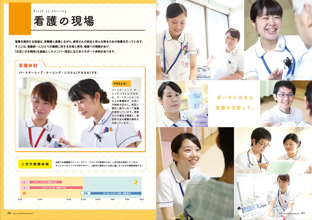 看護部様より看護師募集のツール一式の制作をするにあたり、「やりがいをもって働ける職場」を紹介したいとお話いただきました。